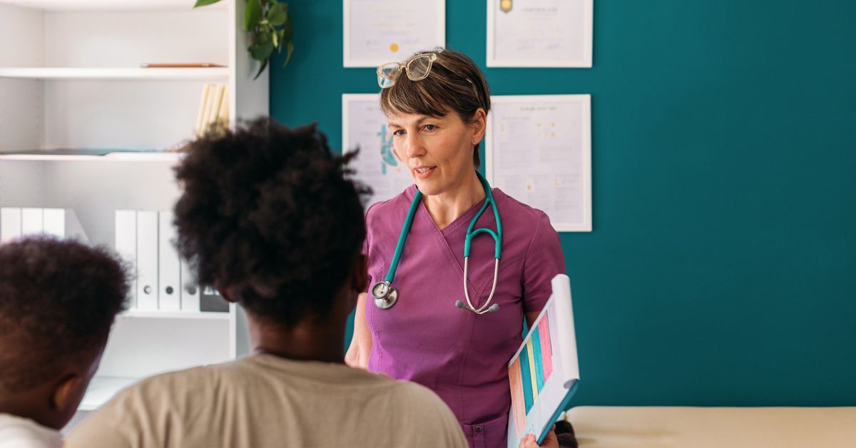 Doctor talks with patient and childShare on Pinterest