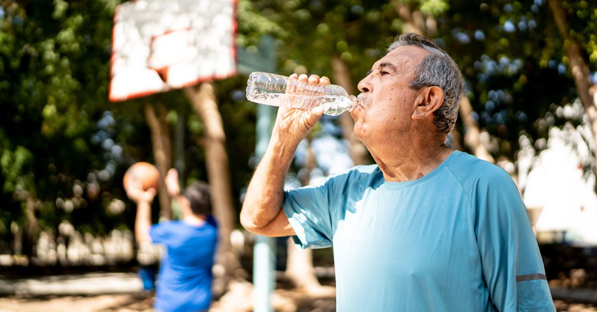 Older male drinking water outside in heatShare on Pinterest