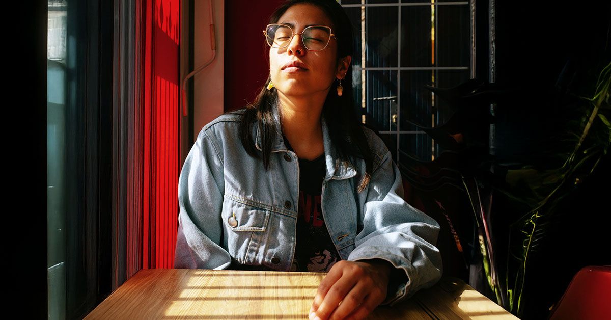 Female basking in a sunbeam by a window in a coffee shopShare on Pinterest