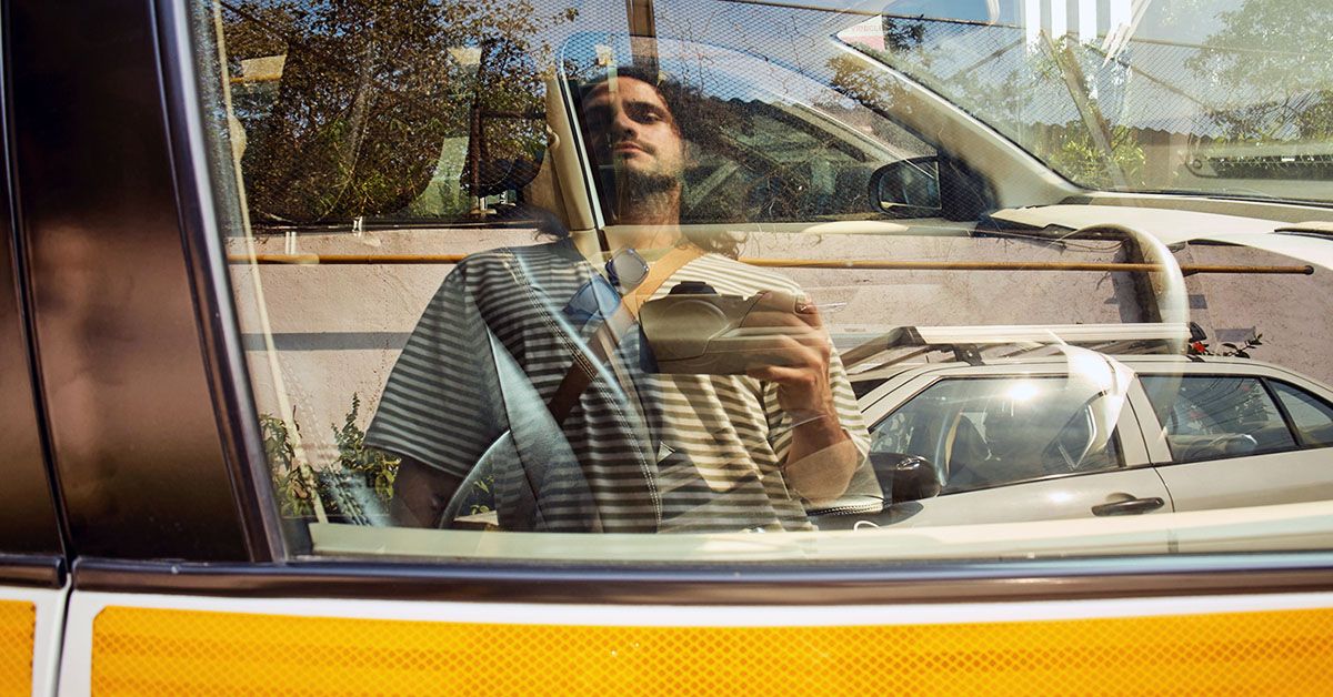 A man looking at his reflection in a car window.Share on Pinterest