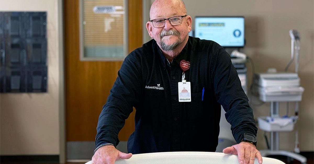 On his drive home while talking with his wife, Joi, he felt pressure in the center of his chest that persisted on and off. The feeling pushed him to drive back to AdventHealth’s ER department.